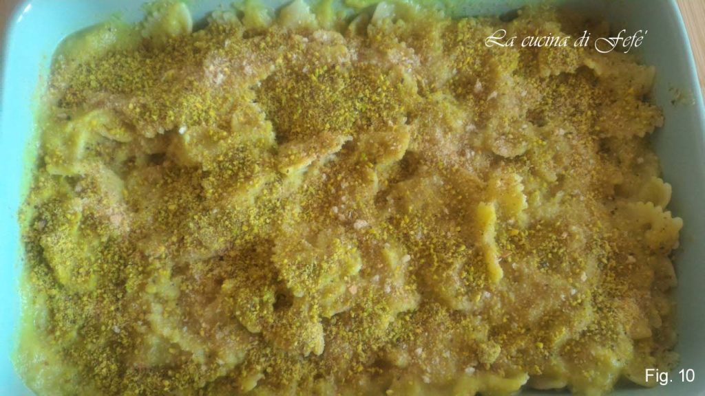 • Meanwhile, boil the farfalle in plenty of salted water and drain them al dente. Transfer the farfalle to a previously buttered baking dish and sprinkle with some breadcrumbs. Then, dress them with the cauliflower cream. Do not skimp (fig. 9).