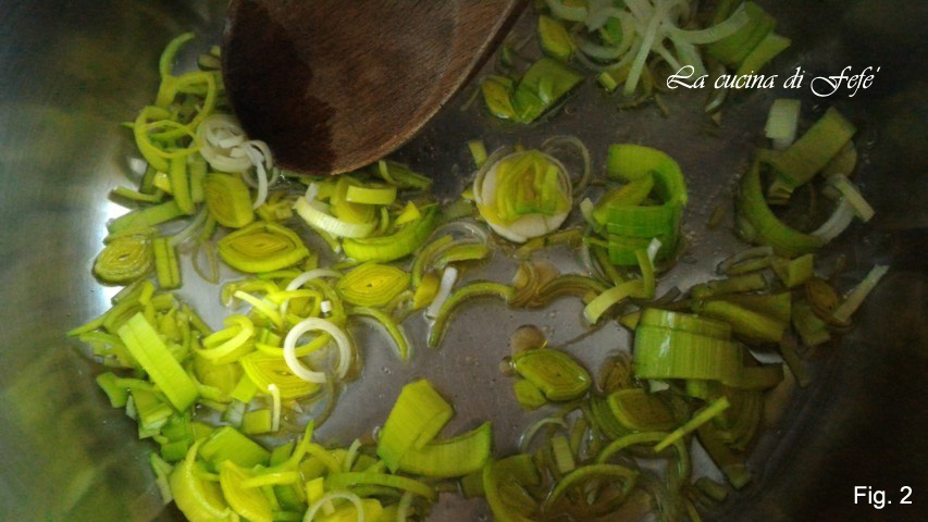 Clean the leek and cut it into rings (including the green part). Sauté it in a large pot with a dash of oil and 2-3 tablespoons of water (fig. 2).