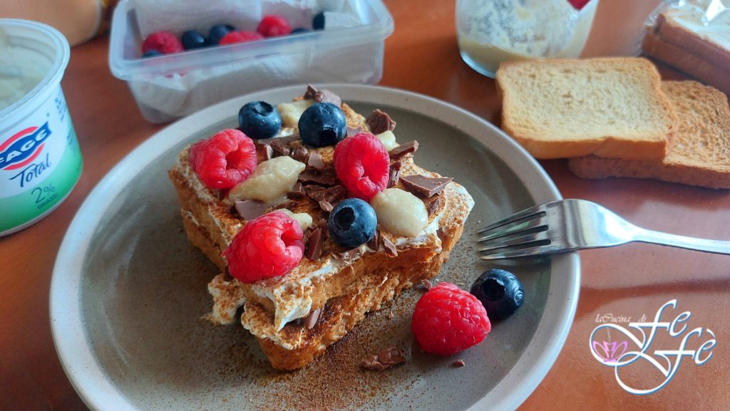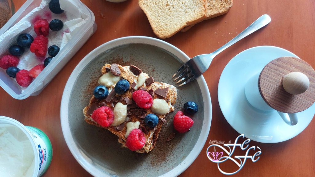 Breakfast is one of the most important meals of the day, accounting for 20% of our daily caloric needs, but we don’t always know how to manage and enjoy it in a nutritionally balanced way! Foods with a low glycemic index should be preferred to avoid the problem of nervous hunger and harmful blood sugar spikes. So, go for a hearty and healthy breakfast to ensure the right energy! After this meal, the body wakes up, hormones regularize, and metabolism is reactivated. This is really important for maintaining a healthy weight, as the body is ready to receive the calories from food, making it easier to maintain a balance in subsequent meals, especially if you are on a diet. After the tower with yogurt and blueberries, here is another delicious alternative that evokes one of the quintessential Italian desserts, tiramisu! Of course, fit! The base is the same: whole grain toast softened in milk and coffee and layered with Greek yogurt, sprinkled with cocoa powder, and dark chocolate shavings. Finally, a touch of homemade tahini and more chocolate shavings. I then added a handful of fresh fruit, but it’s absolutely optional. Paired with a beverage of your choice, this tower will give you the right boost to face the day and a sense of fullness until the next meal!