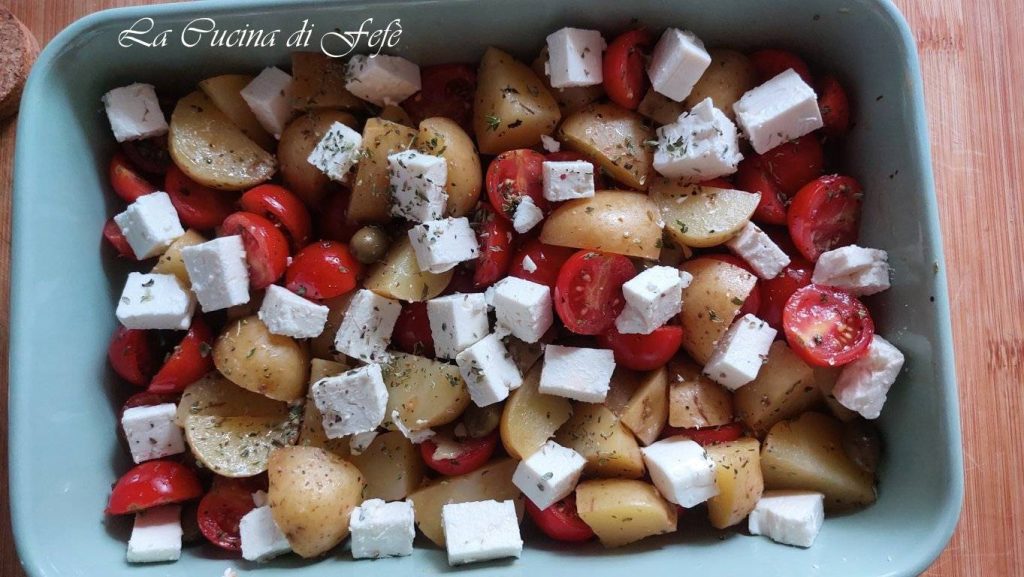 Arrange in a single layer, without overlapping too much, inside a large baking dish. Top with cubes of Greek feta previously drained and patted dry with paper towels and place in a preheated static oven at 392°F for about 35′-40′ or until a nice golden crust forms.