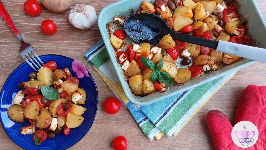 Summer always reminds me of Greece because almost every year, my husband and I choose to explore a new and different Greek island! There, we are captivated by many things, undoubtedly the sea, but also the lovely people and the quite simple homemade food, which I believe is the real charm! The influence of those Mediterranean flavors on some of my dishes is now well known, so much so that in the past I wanted to replicate the famous saganaki shrimp, one of their versatile dishes, and I even created a Greek-style couscous! Feta, which is their cheese par excellence, often accompanies my preparations. So, the other day, having the ingredients for the popular salad in the fridge, I thought it would be interesting to use them to season the potatoes! It’s a piece of cake. You parboil the potatoes for a few minutes, season them with the rest of the ingredients, and then bake everything in the oven! In just over half an hour, your kitchen will be filled with a delicious aroma! And that’s how I brought irresistible Greek style potatoes to the table in three simple steps! Nothing more delightful! An easy vegetarian side and quick dish that will satisfy the tastes of the whole family! A true concentrate of flavors and scents to prepare in advance as an appetizer, but it will also be perfect as a single dish or second course! In short, a rich, versatile, and colorful preparation that will bring joy to your table and conquer even the most demanding palates!