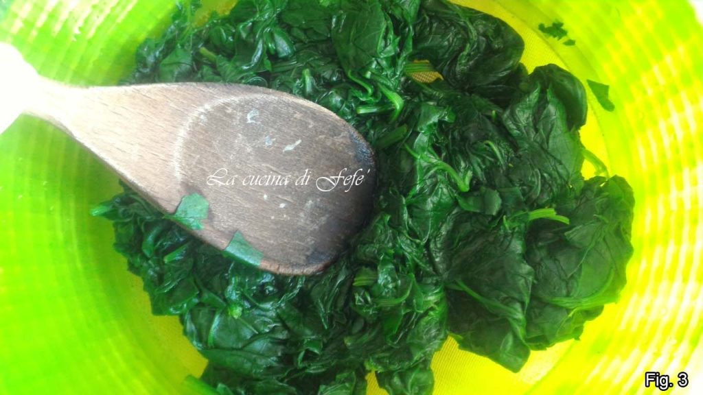 Turn off the heat, let them cool slightly and drain in a sieve, pressing with a spoon if necessary to ensure the spinach releases all their water* (fig. 3).