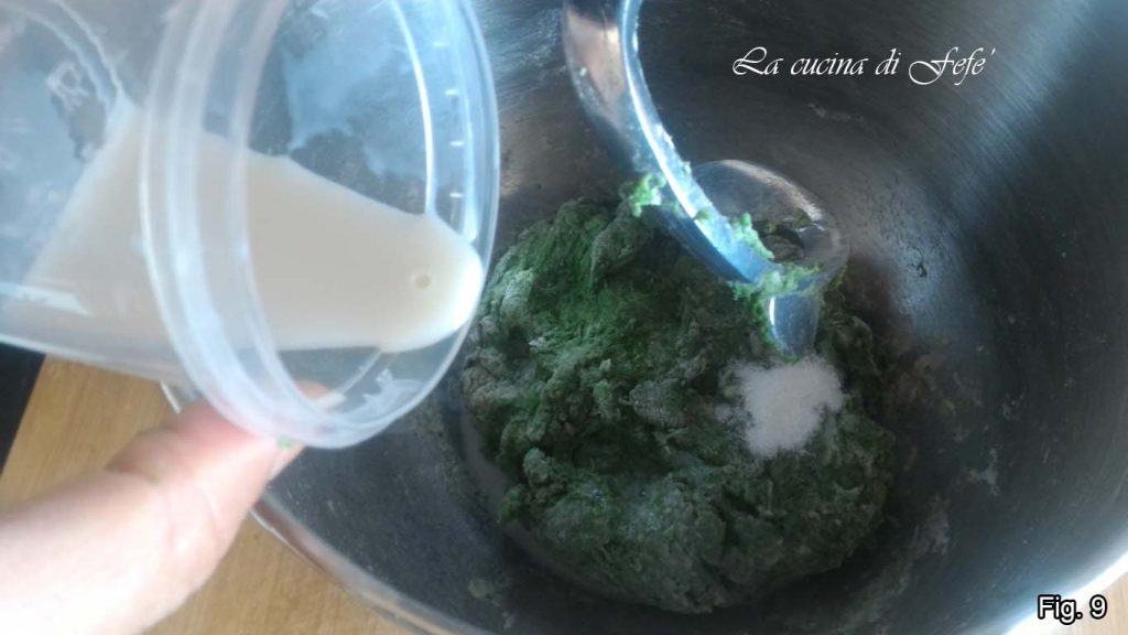Create a well in the center and pour the entire spinach mixture in. Work for a few minutes on medium speed using the hook attachment, then gradually add the oat milk, leaving about 2 tablespoons aside, and continue to work for a few more minutes (fig. 7 and 8).
