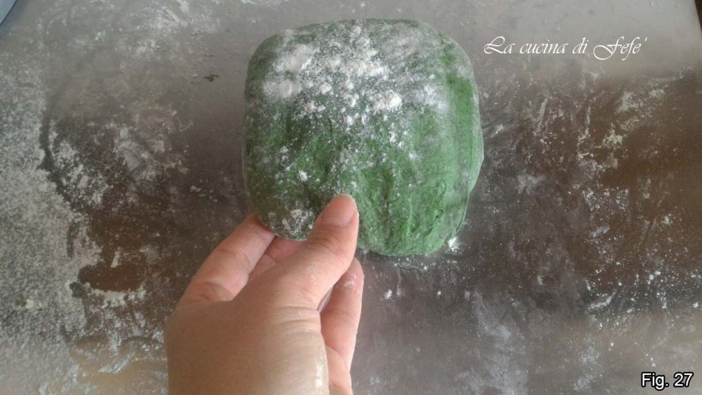 Do the same with the spinach dough, stretching it on the work surface and then folding it in thirds (fig. 25 and 26).