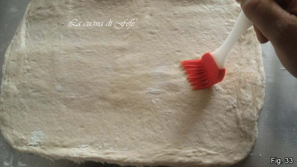 Stretch the white one first on a floured surface with your hands and then with a rolling pin, forming a rectangle about 27×35 cm (10.6×13.8 inch) (fig. 31 and 32).