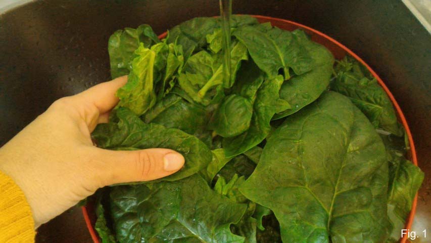 Start by preparing the filling*. Clean the spinach by removing the yellowed leaves and thicker stems, then wash them thoroughly under running water.