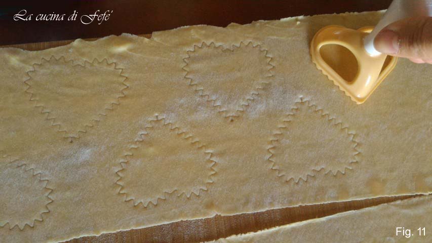 Lay the second sheet over them, matching the edges and making sure to press out the air between each ravioli by pressing around the filling with your fingers to prevent them from opening during cooking. Then, cut the ravioli with the cutter following the direction of the bases.