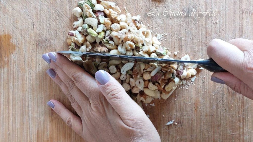 • Separately, gather 3.5 oz of mixed nuts of your choice already shelled (I chose hazelnuts, walnuts, cashews, almonds, and pistachios) and roughly chop them with a knife.