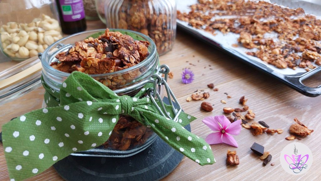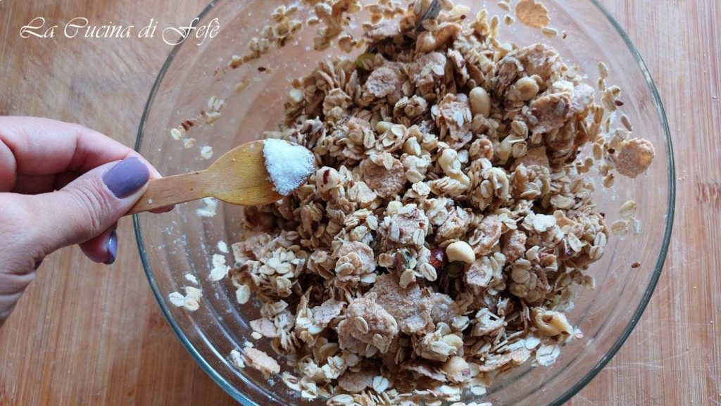 You can choose the combination of cereals, nuts, and seeds you prefer. Once ready, besides chocolate, you can further enrich the granola with dried fruit of your choice such as dates or dried apricots, but keep in mind that if you are following a restrictive diet, this will result in a higher intake in terms of sugars and calories.