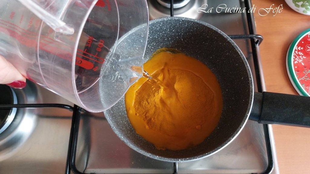 Preparing turmeric paste is really simple and quick: in a saucepan, pour the water and turmeric.