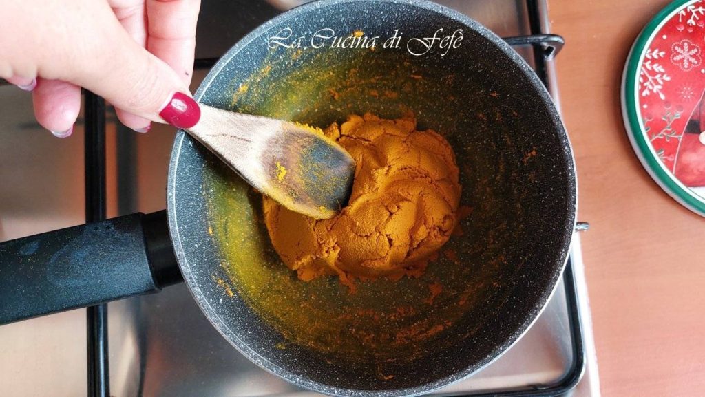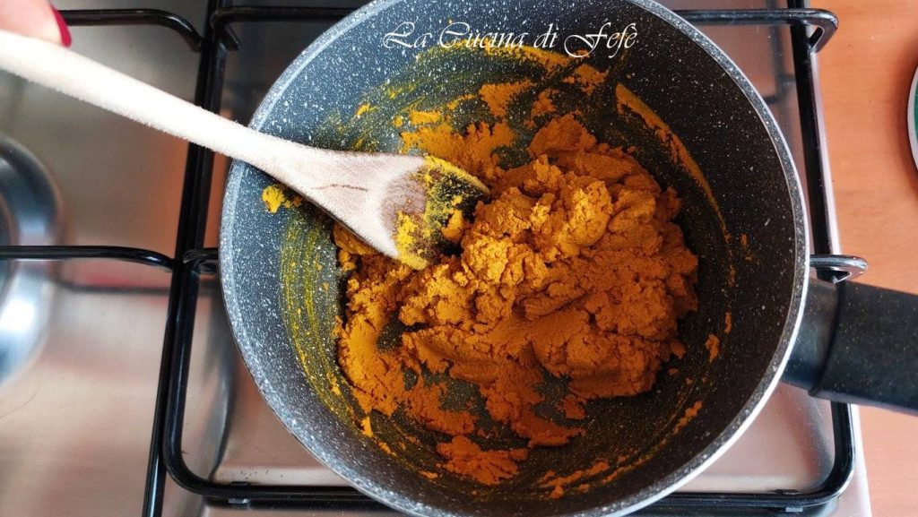 Cook over low heat stirring continuously with a wooden spoon for about 5 minutes, until you get a sandy and smooth paste.