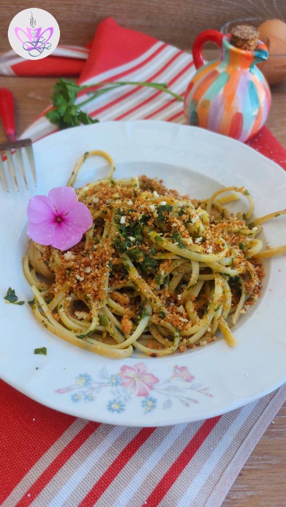 Have you ever found yourself unable to grocery shop for days and almost out of pantry staples to cook with? It happens to me often, especially during flu seasons, when fever keeps you from your activities for a while and you’re forced to economize with the few food supplies at your disposal to get by! These linguine were born out of this need, and it’s really true that “necessity is the mother of invention“! Few and simple ingredients, the ones we all have at home, for a vegetarian main course easy and delicious, made with a smart recycling sauce based on parsley and lime that’s finger-licking good! As a good Sicilian, I have enriched the dish further with some breadcrumbs toasted in a pan with a little oil, a delight! So, if you also have a nice bunch of parsley about to wilt in the fridge and you don’t know how to dispose of it, try this practical and at the same time appetizing idea with just two steps at the stove and in a handful of minutes! It will be the perfect solution when you have unexpected guests or want to prepare a quick dish without much time and even less money! In short, a no-waste dish in pure economy style but with excellent final yield!