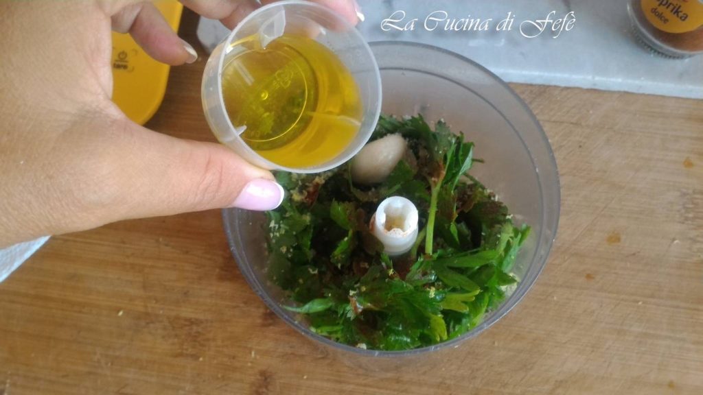 Finally, add a pinch of salt, the chili, and pour in the oil gradually.