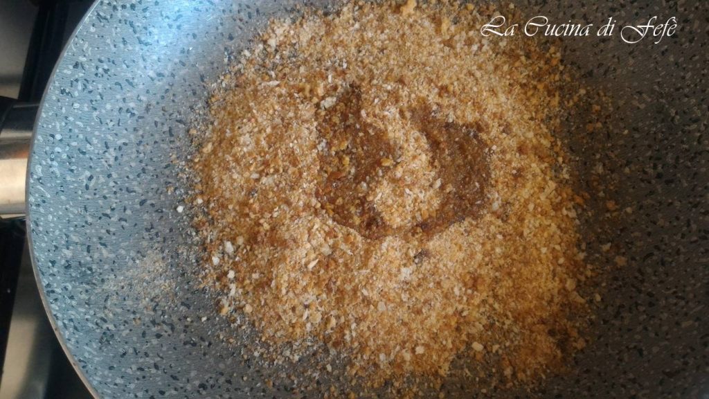 In a separate non-stick pan, toast the breadcrumbs with 1 tablespoon of oil.