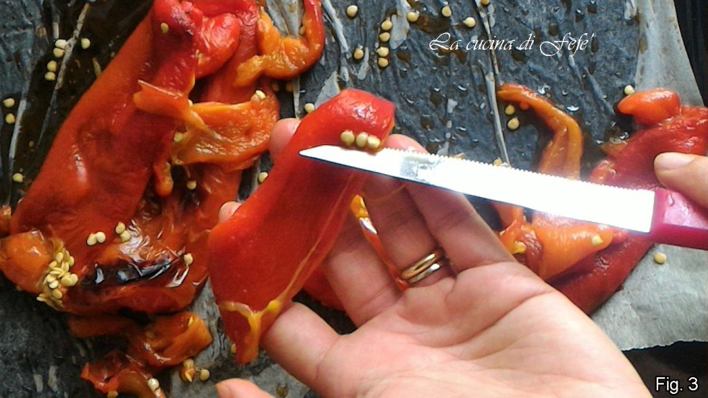 Wash the bell peppers and dry them well. Place them well spaced on a baking tray lined with parchment paper and bake for about 45 minutes at 392°F, then peel them and remove the seeds.