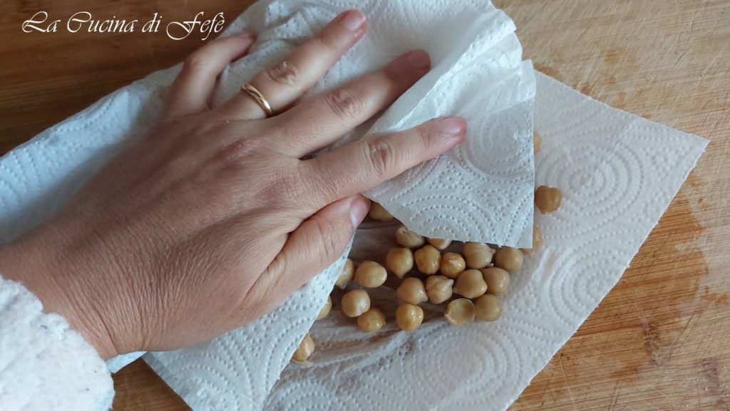Pat the chickpeas dry with paper towels, rubbing them with your hands. This helps remove the often-indigestible skins more easily and you can remove them quickly. I recommend this step, but it is optional.