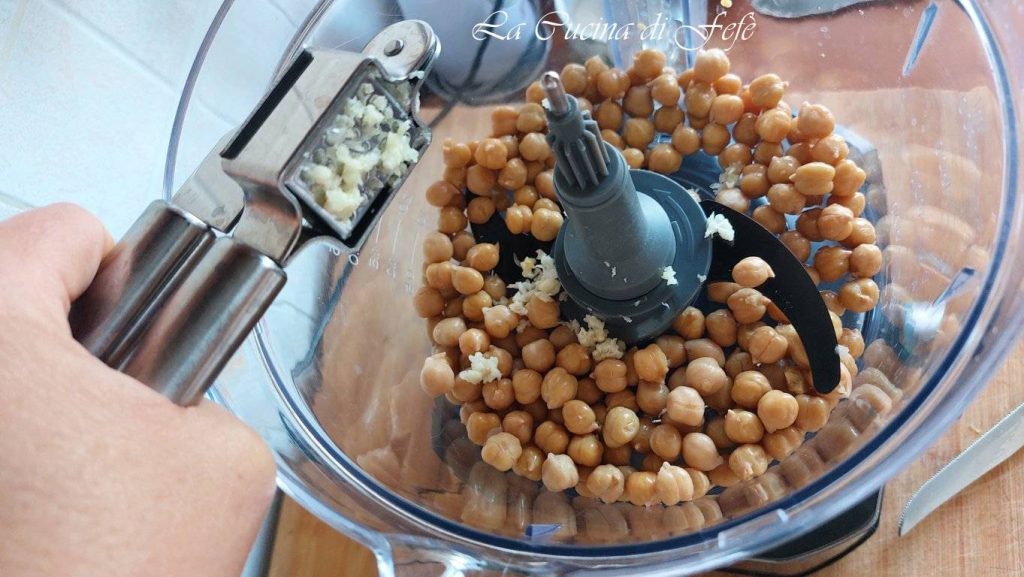 Meanwhile, in the bowl of a food processor, place the pre-cooked chickpeas and the garlic pulp crushed with a garlic press.