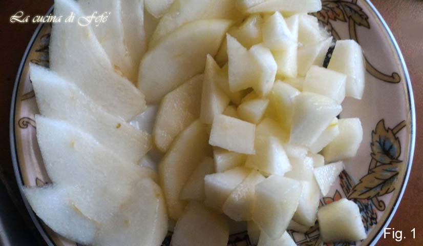 Start by washing the pear, peel it and cut it, after removing the core and seeds, half into chunks and the rest into thin slices, then immediately drizzle everything with lemon juice (fig. 1).