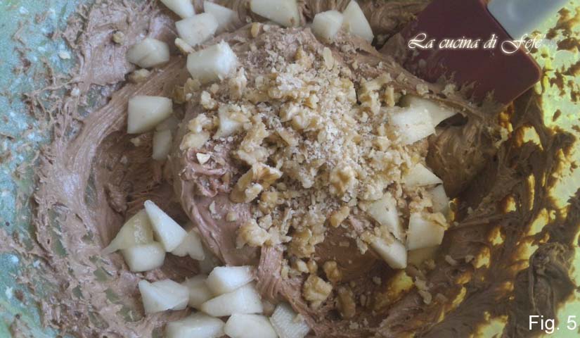 Incorporate the eggs, one at a time and strictly at room temperature, and pour in the white Vermouth. Mix the sifted flour, baking powder, and cinnamon and blend them with the rest. Also incorporate the cooled butter and chocolate mixture, then the milk, chopped walnuts, and pear chunks (fig. 5).