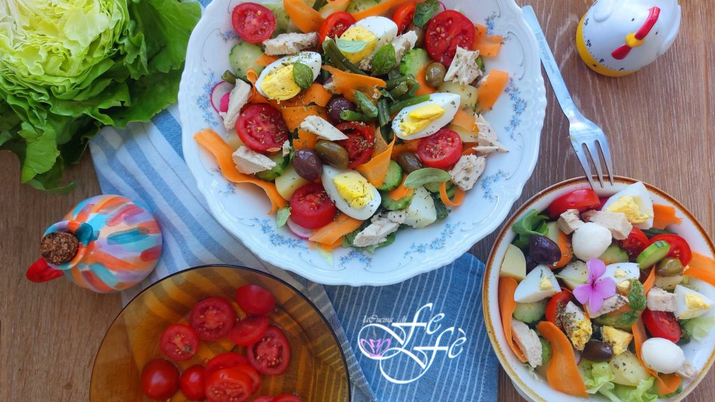 Friends, today I am offering you a recipe that, just like word-of-mouth, was suggested to me by a friend who in turn discovered its existence thanks to another friend of hers! Well, you know how these things happen when women get together!? They exchange ideas, suggestions, advice, and the result is always very stimulating and particularly constructive. In this case, thanks to them, I got to know the Niçoise salad, in French salade niçoise, a typical dish of the French Riviera and particularly of Nice. However, this salad has now spread throughout the Mediterranean area, albeit with many variations. The most well-known version in Italy, for example, is the Ligurian one called condiglione. Undoubtedly, the common denominator is always a fresh dish, perfect in summer for a lunch or dinner when temperatures start to rise! The undisputed stars are the green beans, now already available at fruit and vegetable markets, but also green salad, potatoes, tuna, tomatoes, eggs, sometimes anchovies, and much more, dressed with a generous dose of vinaigrette made of extra virgin olive oil and vinegar. In short, it’s a salad, but with undisputable protein intake and a rich taste that gives this dish a much broader definition of simple side dish! In short, a triumph of colors and flavors, a nutritious and balanced meal that elevates it to an appetizer if not even a main course! Take it with you to the beach, on a picnic outdoors, or perhaps to enjoy in the garden when you don’t feel like cooking much, because, apart from a few ingredients, everything can be quickly cut and added raw!