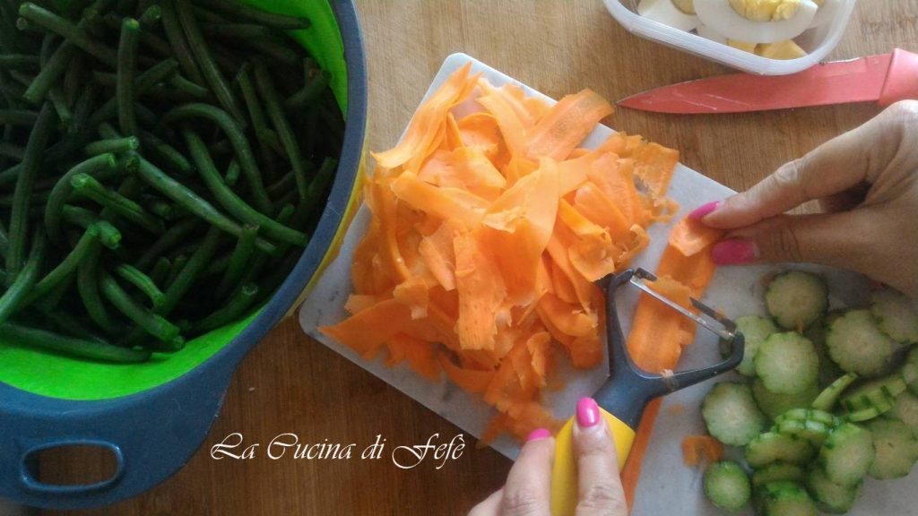 • Wash, peel, and cut the potatoes into cubes. Steam them along with the green beans or alternatively, boil them in plenty of unsalted water for about 15 minutes from boiling, but I recommend sticking a fork to evaluate the degree of doneness you prefer. In any case, they should not be overcooked, but more al dente.