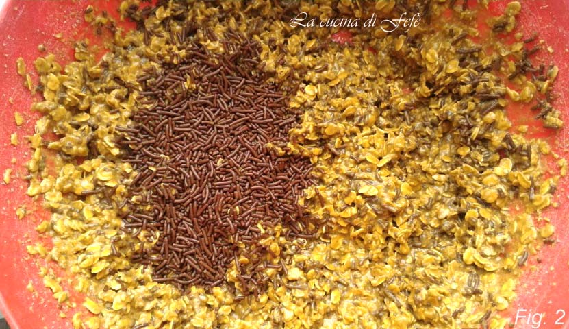 Once the first ingredients have been incorporated, proceed to add the flour, the baking powder previously dissolved in oat milk, and finally the chocolate sprinkles (fig. 2).