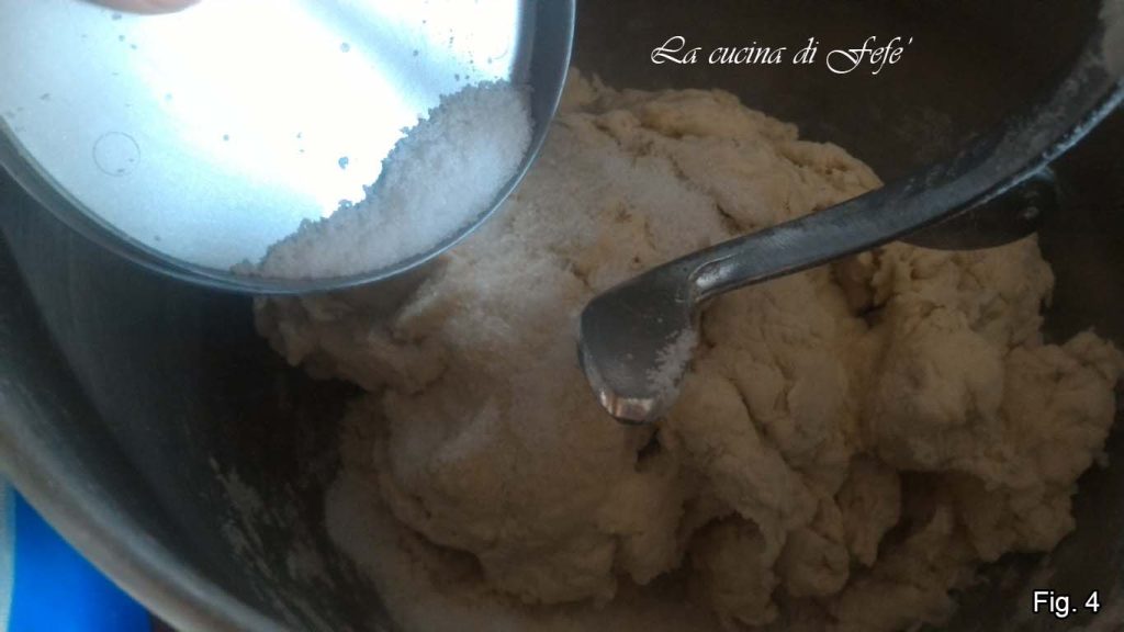 In the bowl of a stand mixer, combine the two flours previously sifted with the yeast and mix with a wooden spoon.
