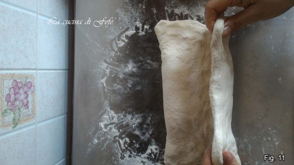 Let the dough slide onto the floured work surface, stretch it with your hands until you form a rectangle.