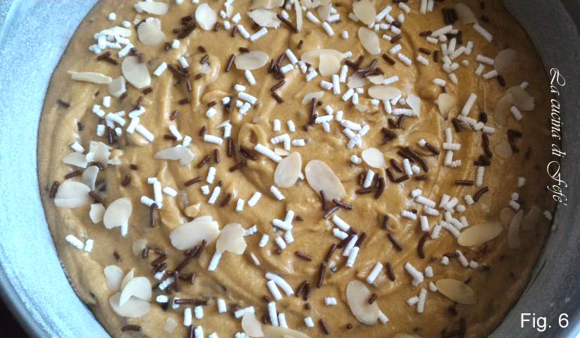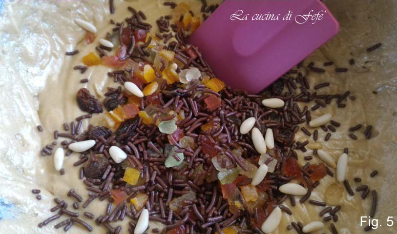 Incorporate the pine nuts, candied fruits, and chocolate sprinkles, lightly floured to prevent sinking into the batter, or avoid over-mixing (fig. 5).