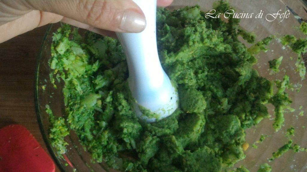 Drain the florets and stems with a slotted spoon, let them cool slightly, transferring them into a bowl, and lightly mash them with a potato masher.
