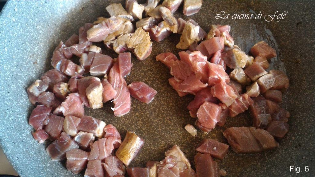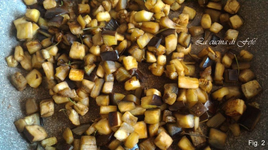 Wash the eggplant, remove the stem and cut it into cubes. Let them wilt in a pan with 2 tablespoons of oil and 2 tablespoons of water, and a whole sprig of rosemary.