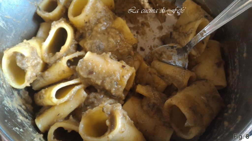 Drain the pasta al dente, saving a couple of ladles of water. Dress it with the eggplant cream and thin with the cooking water.
