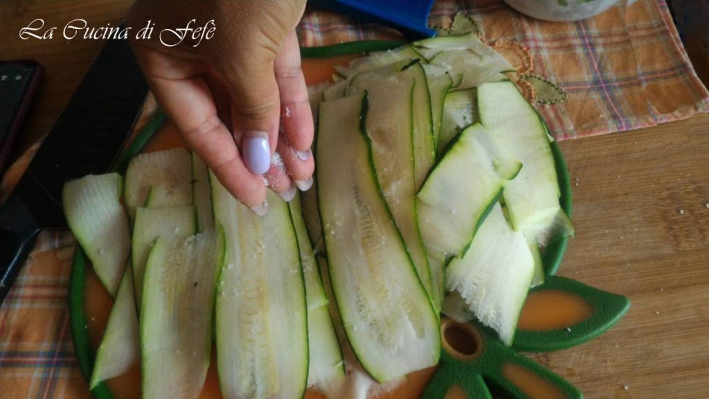 Start by washing and trimming the zucchinis. With the help of a slicer or mandoline, slice them into very thin ribbons.