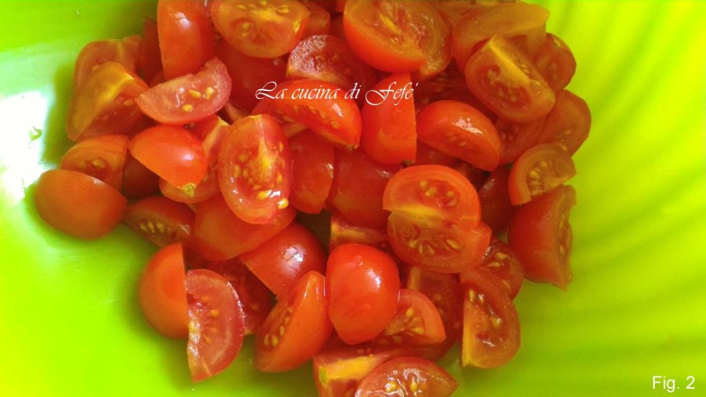 Wash the cherry tomatoes, dry them, clean and quarter them (fig. 2).