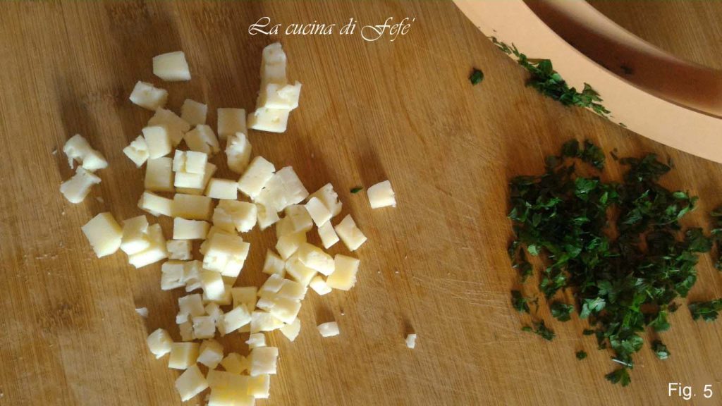 Meanwhile, dice the asiago. Wash the parsley, dry it, and finely chop it with a mezzaluna (fig. 5).
