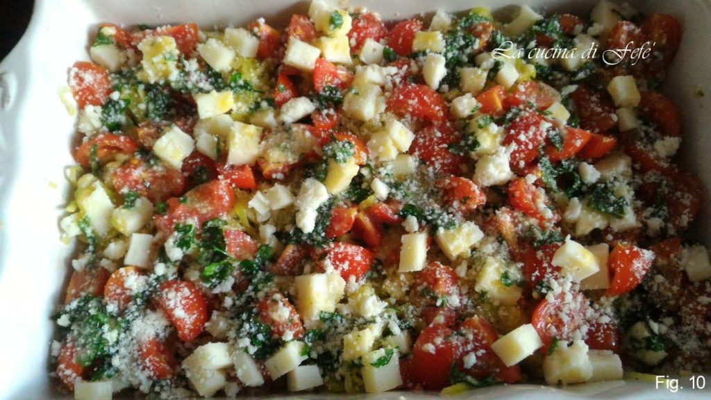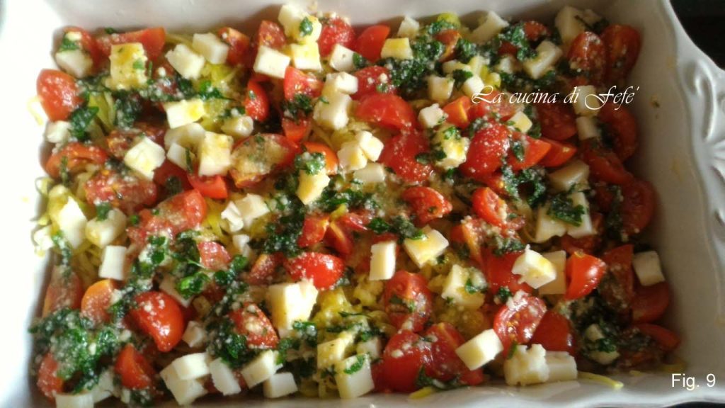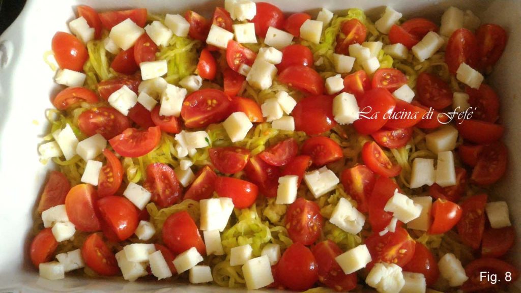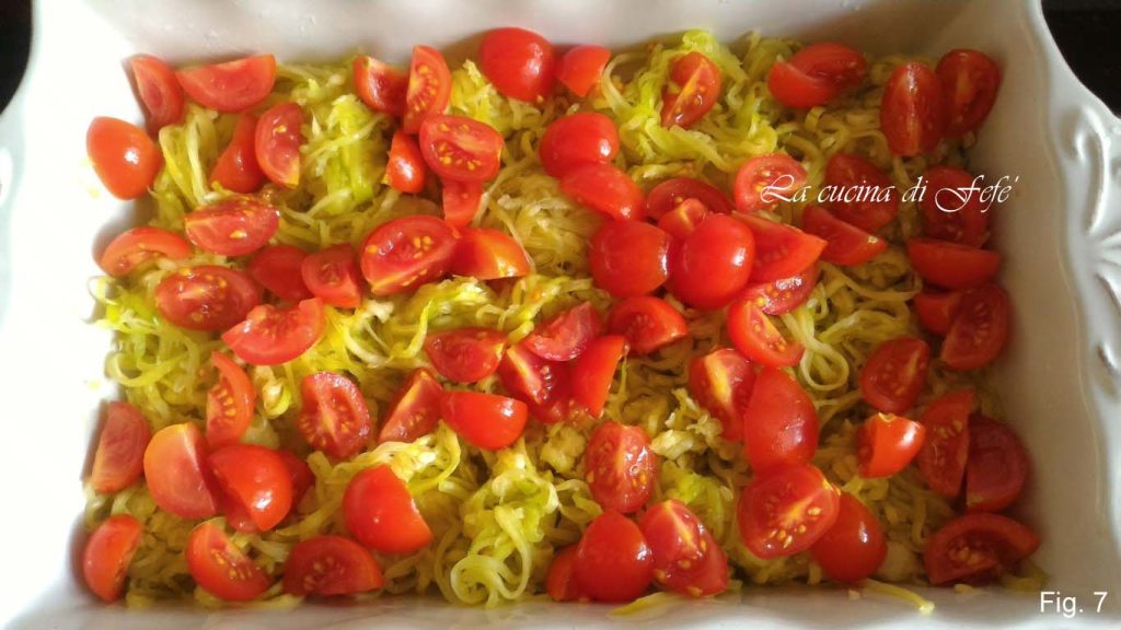 Squeeze the zucchini spaghetti well of all residual water. Do the same if you grated them and transfer them to a slightly buttered baking dish and spread the cherry tomatoes over them (fig. 7).