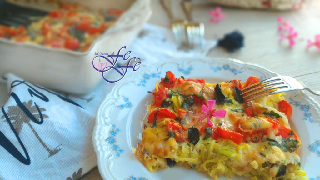 In my house, the watchword is freshness and genuineness, especially in summer! Vegetables take on a much less marginal role compared to the past, and I like to add a touch of originality instead of proposing the usual and trivial side dishes! Moreover, it seems that creativity in cooking vegetables makes it easier to follow the golden advice from nutritionists, which is to consume a total of five portions of fruits and vegetables a day. Fortunately, there is much more awareness about choosing to eat healthily but with taste, and this is especially evident with the spread of dietary models such as vegetarianism, veganism, and even raw foodism! Those who know me know that I have not strictly adhered to any of these forms, but I have revolutionized my eating routine due to an initial health problem, eating a bit of everything and continuously varying. Little meat, lots of strictly seasonal vegetables, dishes based on legumes, and oven cooking with the aim of keeping light and getting all the necessary nutrients. This dish I present to you today has all the credentials to become your favorite, and although I propose it as a side dish, it can also become a delicious appetizer that you can bake directly in single-serving cocottes! If you have a spiral slicer, then the game is made! You can easily make zucchini spaghetti, which are the base of this recipe, as well as many others I will propose over time that will give you great satisfaction! Otherwise, you can grate them to simulate their texture on the palate as much as possible! In short, a simple and genuine casserole, very aromatic, with that touch of saltiness given by the pecorino which will give the ensemble an undeniable originality!