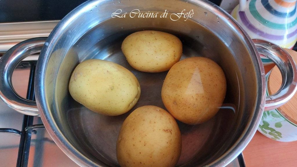 • Wash the potatoes very well under running water and boil them in a saucepan with plenty of water for about 20-25 minutes from when it starts to boil. The tines of a fork should easily pierce through.