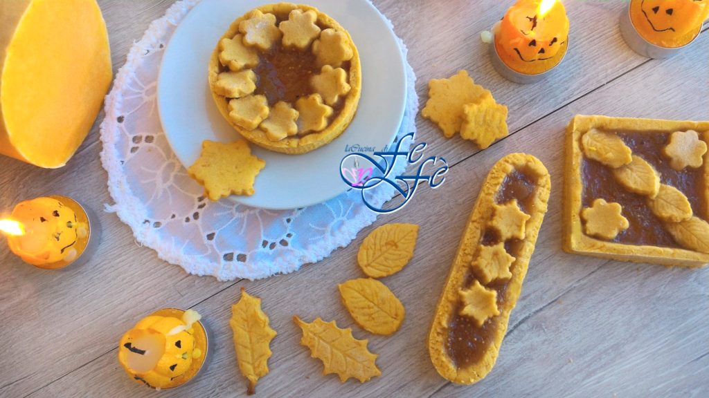 And here is a fun idea to use the pumpkin shortcrust pastry I proposed to you a few days ago! I made them to soberly celebrate the Halloween party, which although I don’t love it, I share just for the fun spirit! You, on the other hand, can prepare them for any other occasion, because they are perfect for a snack, for breakfast, and, given their size, also as birthday treats! These are indeed pumpkin shortcrust tartlets with a heart of fig jam, the last of my homemade preserves. The combination of these two flavors is truly surprising, definitely an unconventional pairing that will win over the whole family! Soon I will also post the cookies I made with the leftover dough, another fun idea for decorating cakes, ice cream bowls, or simply enjoyed pure with tea. The recipe is based on rice flour, making it perfect even for those who are gluten intolerant. However, you can vary it with other flours and more indulgent fillings such as chocolate, and play with flavor combinations.