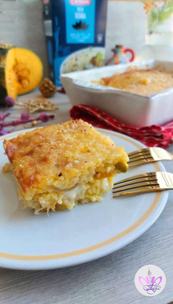 Christmas is approaching, and with it, the frantic search for this or that recipe to experiment with to bring tasty ideas to the table without too much effort in the kitchen. Today, therefore, I propose a vegetarian main course rich in aromas and flavors, the pumpkin and smoked scamorza rice timbale! Besides its genuineness and goodness, this dish is indeed simple to make and perfect for these Christmas holidays, but also for a quiet Sunday family lunch! Its ace up its sleeve is the possibility of being able to prepare it in advance and then warming it up in the microwave a few minutes before serving, or preparing the pumpkin risotto base, putting it aside, and assembling it when needed! It’s a joker dish that will meet everyone’s taste, especially thanks to a melting cheese heart and a crispy crust on top that will literally make you lose your mind!