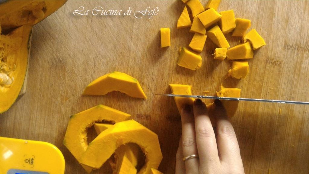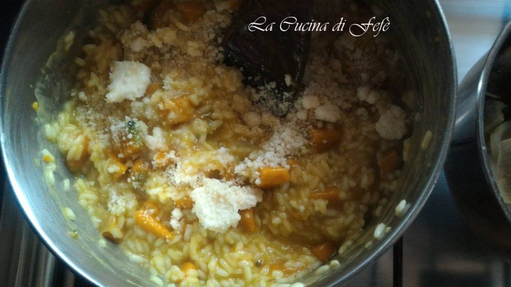 Add the diced pumpkin and let it flavor for another 2′, stirring continuously with a wooden ladle.