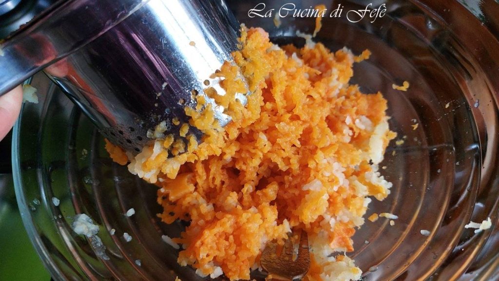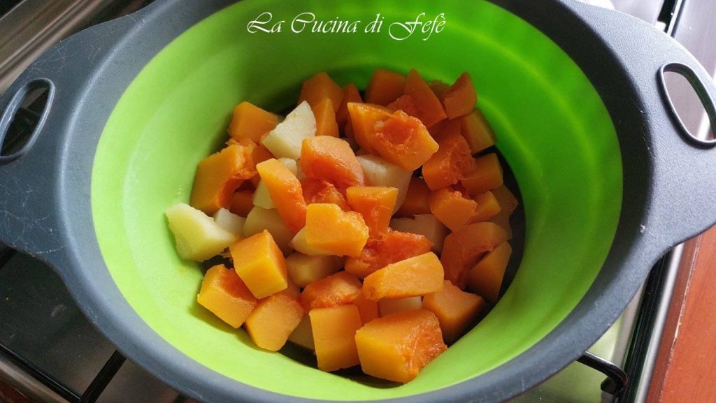 In a saucepan, boil the diced pumpkin and potato in salted boiling water for about 15′ from the start of boiling or until they appear well-cooked. Alternatively, you can steam them for 20′.