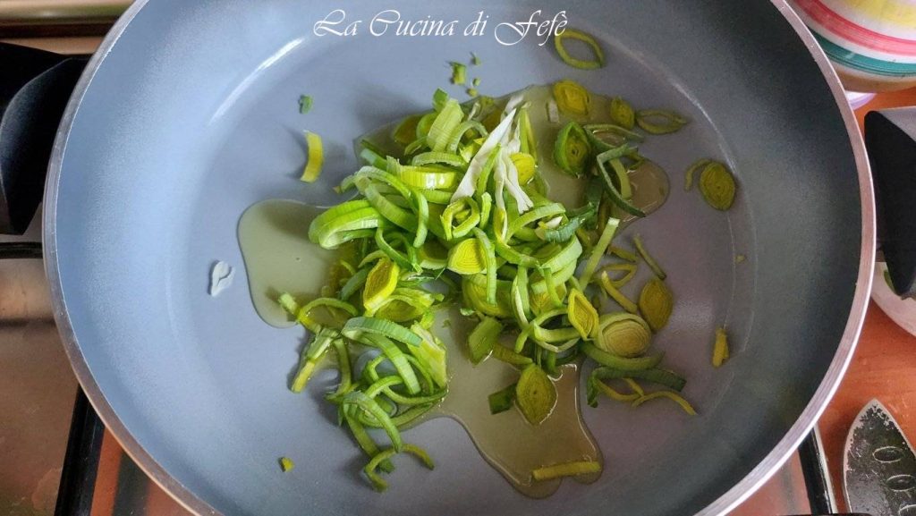 In the meantime, while the puree is cooling, in a non-stick pan, stew the leek with a generous drizzle of oil for about 2‘ over low heat.