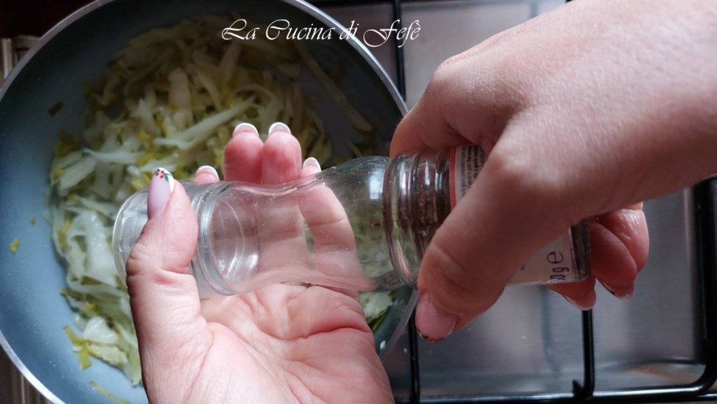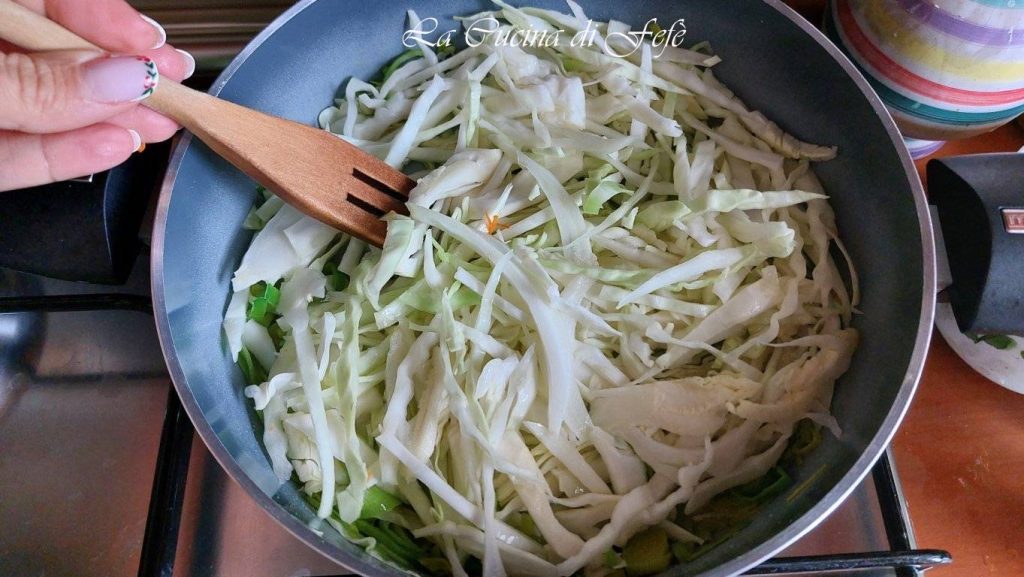 Wash the leek and the cabbage leaves under running water, spin them dry in a salad spinner, then slice the former into very thin rings and the latter into julienne strips.