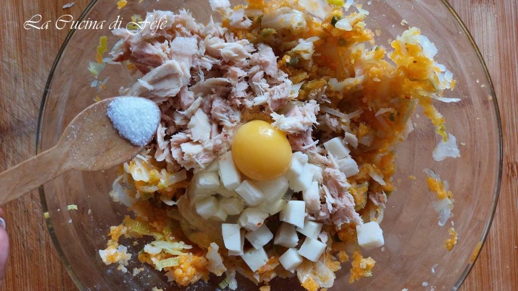 Now incorporate the egg, the spicy provolone in cubes, the drained and well-shredded tuna, and a pinch of salt.