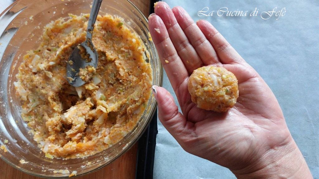 You should obtain a homogeneous mixture. With your hands always well moistened, take small portions of the mixture and form meatballs slightly larger than a walnut.