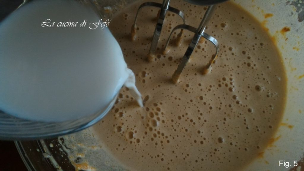 In a separate bowl, mix the dry ingredients, such as the sifted flour and cornstarch with the baking powder and incorporate them into the liquid ones (fig. 6).