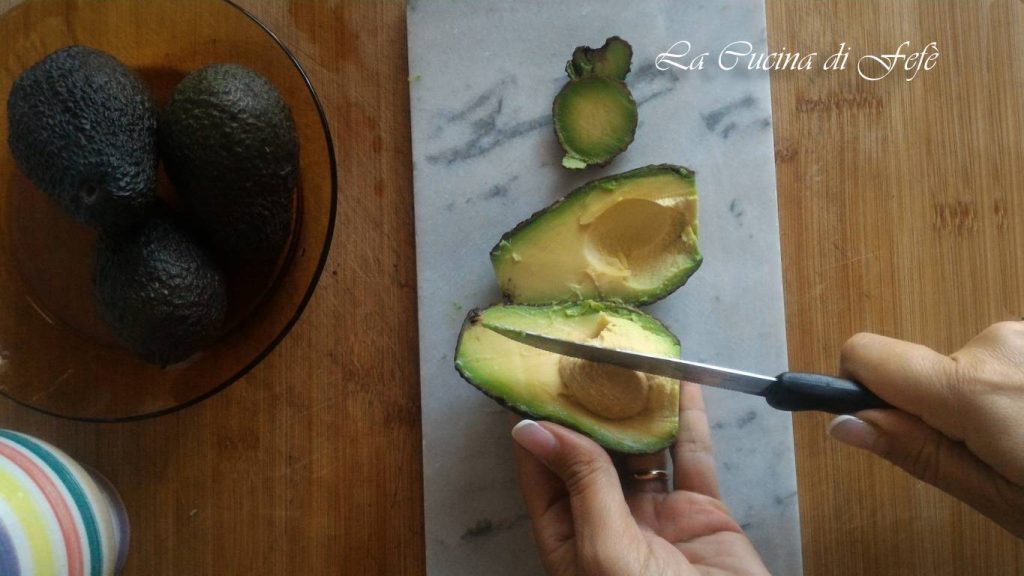 Wash the avocados by thoroughly scrubbing the skin under running water. With a knife, cut them in half and remove the pit.
