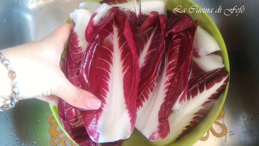 Take 12 large and intact leaves from your radicchio, among the outermost ones, and rinse each one thoroughly under running water, being careful not to break them.