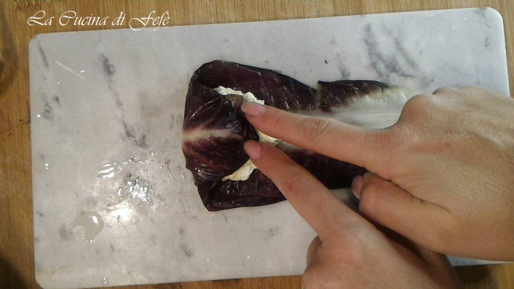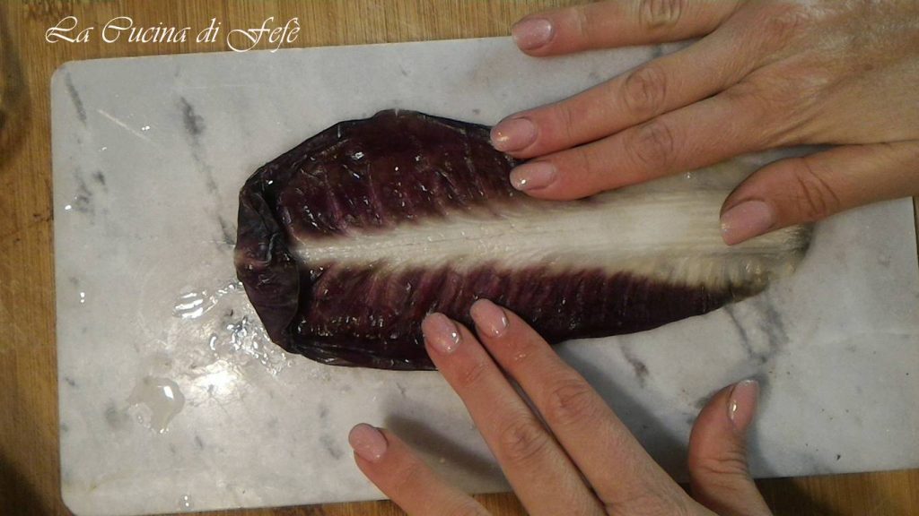 Now, on a cutting board, spread each radicchio leaf by expanding it with your fingers without adding extra salt.